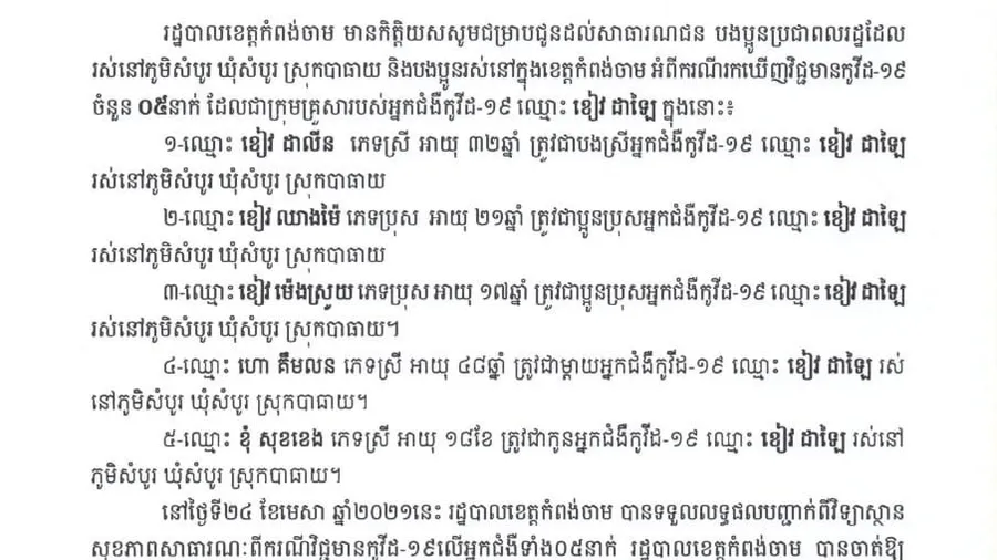 សេចក្តីប្រកាសព័ត៌មាន របស់រដ្ឋបាលខេត្តកំពង់ចាម ស្តីពីករណីរកឃើញវិជ្ជមានកូវីដ-១៩ ចំនួន០៥នាក់ ជាក្រុមគ្រួសារអ្នកជំងឺកូវីដ-១៩ ឈ្មោះ ខៀវ ដាឡៃ នៅភូមិសំបូរ ឃុំសំបូរ ស្រុកបាធាយ