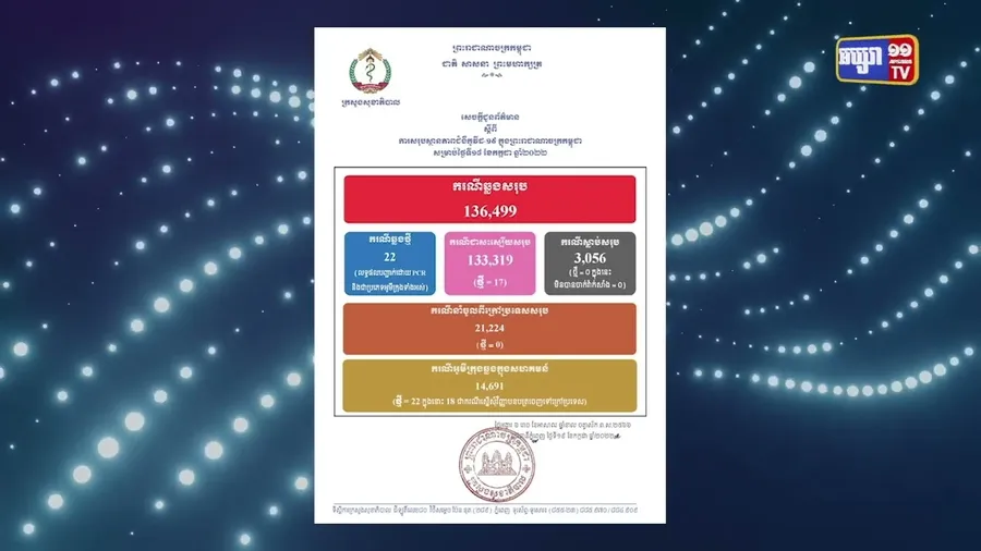 តួលេខឆ្លងថ្មីនៃជម្ងឺកូវីដ១៩ មិនបានធ្លាក់ចុះឡើយនៅថ្ងៃនេះ។ តួលេខឆ្លង២៤ម៉ោងកន្លង មកនេះ មានចំនួន២២នាក់ ដែលស្មើនឹងតួលេខឆ្លងកាលពីម្សិលមិញ។ កម្ពុជាដែលគ្មានការ ឆ្លងជាងមួយខែកន្លះមកហើយនោះ ទើបបានរកឃើញការឆ្លងថ្មីសាឡើងវិញទើប ប្រមាណ ២១ថ្ងៃមកនេះ។ ក្នុងរយៈពេល២១ថ្ងៃកន្លងមកនេះ ការរកឃើញឆ្លងឡើងវិញមានចំនួន សរុប២២១នាក់ហើយ ។