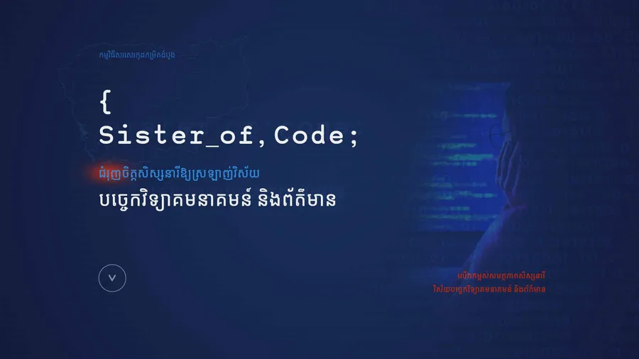 Sisters of Code ជាកម្មវិធីលើកកម្ពស់វិស័យបច្ចេកវិទ្យាព័ត៌មានសម្រាប់ក្មេងស្រីដំបូងគេបង្អស់នៅកម្ពុជា។ កម្មវិធីបង្រៀនមូលដ្ឋានគ្រឹះនៃការសរសេរកូដកម្មវិធីកុំព្យូទ័រដោយឥតគិតថ្លៃនេះ មានរយៈពេល៦ខែ និងទទួលសិស្សនារីអាយុចន្លោះពី១០ឆ្នាំទៅ១៨ឆ្នាំ។Sister of Codeកម្មវិធីលើកកម្ពស់វិស័យបច្ចេកវិទ្យាព័ត៌មានរយៈពេល៦ខែ
