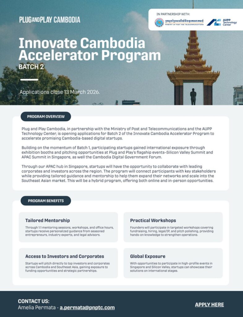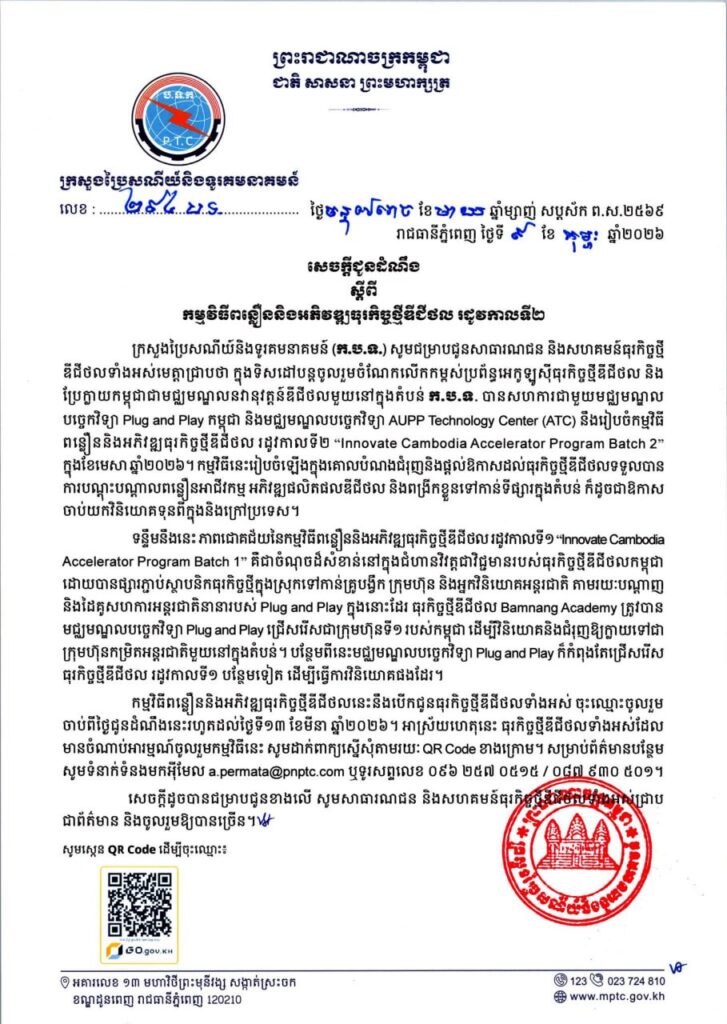 (ភ្នំពេញ)៖ ក្រសួងប្រៃសណីយ៍និងទូរគមនាគមន៍ (ក.ប.ទ.) សូមជម្រាបជូនសាធារណជន និងសហគមន៍ធុរកិច្ចថ្មីឌីជីថលទាំងអស់មេត្តាជ្រាបថា ក្នុងទិសដៅបន្តចូលរួមចំណែកលើកកម្ពស់ប្រព័ន្ធអេកូឡូស៊ីធុរកិច្ចថ្មីឌីជីថល និងប្រែក្លាយកម្ពុជាជាមជ្ឈមណ្ឌលនវានុវត្តន៍ឌីជីថលមួយនៅក្នុងតំបន់ ក.ប.ទ. បានសហការជាមួយមជ្ឈមណ្ឌលបច្ចេកវិទ្យា Plug and Play កម្ពុជា និងមជ្ឈមណ្ឌលបច្ចេកវិទ្យា AUPP Technology Center (ATC) នឹងរៀបចំកម្មវិធីពន្លឿននិងអភិវឌ្ឍធុរកិច្ចថ្មីឌីជីថល រដូវកាលទី២ “Innovate Cambodia Accelerator Program Batch 2” ក្នុងខែមេសា ឆ្នាំ២០២៦។