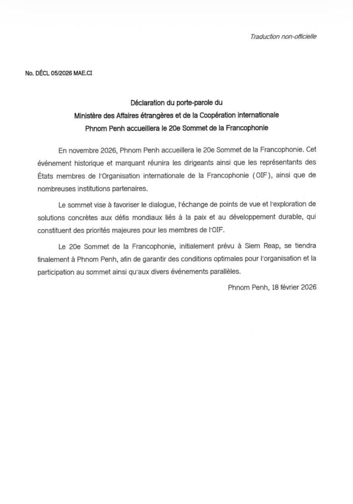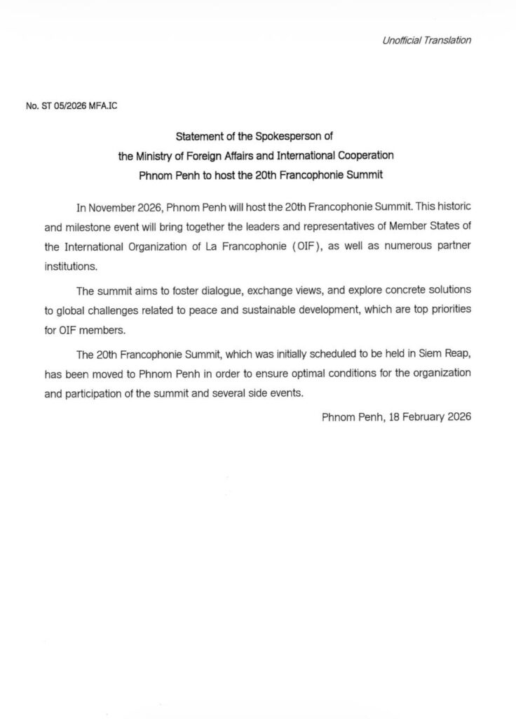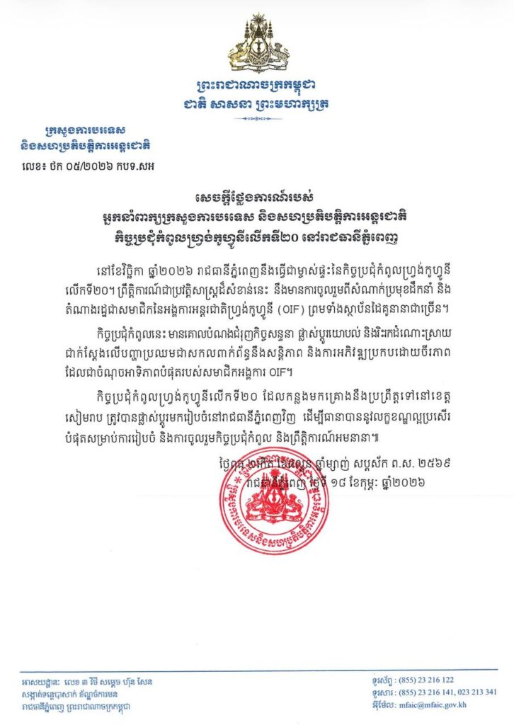 ក្រសួងការបរទេស និងសហប្រតិបត្តិការអន្តរជាតិ បានប្រកាសថា កិច្ចប្រជុំកំពូលហ្វ្រង់កូហ្វូនីលើកទី២០ ដែលកន្លងមក គ្រោងនឹងប្រព្រឹត្តទៅនៅខេត្តសៀមរាប ត្រូវបានផ្លាស់ប្តូរមករៀបចំនៅរាជធានីភ្នំពេញវិញ។