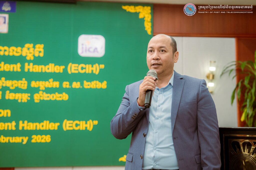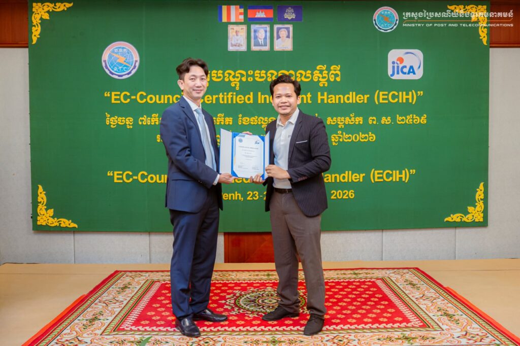 ភ្នំពេញ៖ ឯកឧត្តម ខូវ មករា រដ្ឋលេខាធិការក្រសួងប្រៃសណីយ៍និងទូរគមនាគមន៍ កាលពីថ្ងៃទី២៥ ខែកុម្ភៈ ឆ្នាំ២០២៦ បានអញ្ជើញជាអធិបតីបិទវគ្គបណ្តុះបណ្តាល “EC-Council Certified Incident Handler (ECIH)” ដែលជាកម្មវិធីបណ្តុះបណ្តាលស៊ីជម្រៅផ្តោតលើការគ្រប់គ្រង និងការឆ្លើយតបទៅនឹងឧប្បត្តិហេតុសន្តិសុខសាយប័រ (Incident Response) ចាប់ពីថ្ងៃទី២៣-២៥ ខែកុម្ភៈ ឆ្នាំ២០២៦ និងមានការអញ្ជើញចូលរួមពីមន្ត្រី និងបុគ្គលិកជំនាញមកពី ១៩ ក្រសួង-ស្ថាប័នរដ្ឋ ប្រតិបត្តិករហេដ្ឋារចនាសម្ព័ន្ធព័ត៌មានសំខាន់ៗ ប្រតិបត្តិករសេវាអ៊ីនធឺណិត និងស្ថាប័នហិរញ្ញវត្ថុនិងធនាគារ សរុបប្រមាណ ៣០រូប នៅសណ្ឋាគារហ៊ីម៉ាវ៉ារី រាជធានីភ្នំពេញ។