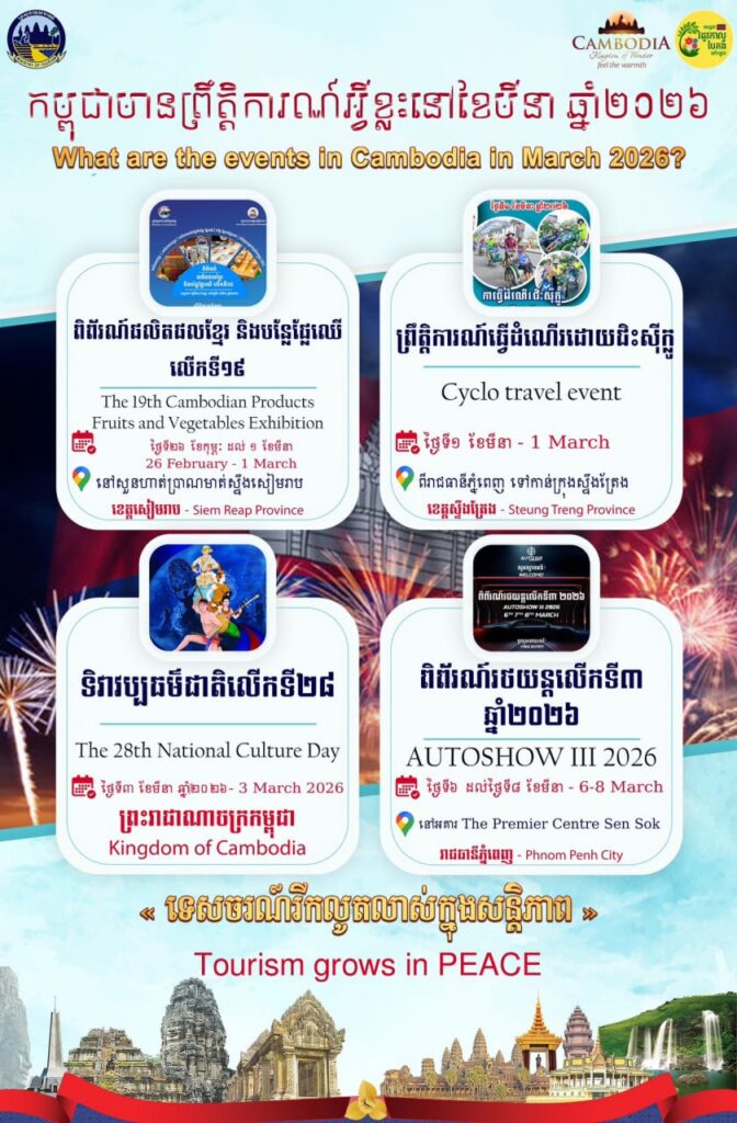 នៅថ្ងៃទី៣ ខែមីនា នឹងមានទិវាវប្បធម៌ជាតិលើកទី២៨ នៃព្រះរាជាណាចក្រកម្ពុជា ខណៈពីថ្ងៃទី៦ ដល់ថ្ងៃទី៨ ខែមីនា នឹងមានពិព័រណ៍រថយន្តលើកទី៣ ឆ្នាំ២០២៦ នៅរាជធានីភ្នំពេញ ។