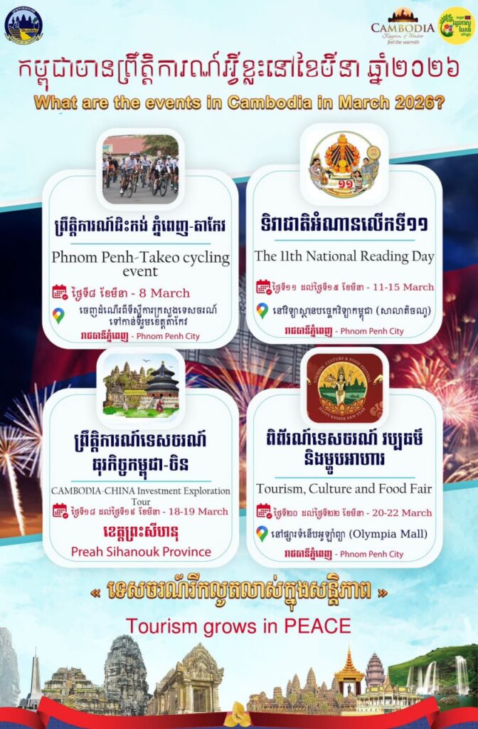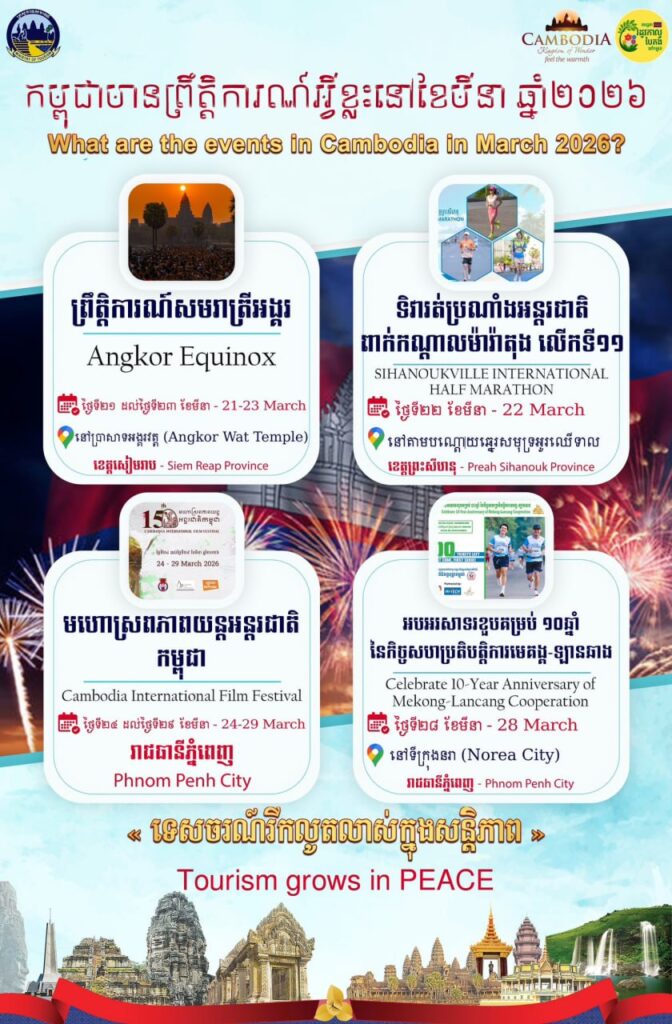 បើតាមក្រសួងទេសចរណ៍ប្រកាសឱ្យដឹងក្នុងខែមីនា ឆ្នាំ២០២៦ព្រះរាជាណាចក្រកម្ពុជានឹងមានព្រឹត្តិការណ៍ទេសចរណ៍សំខាន់ៗ