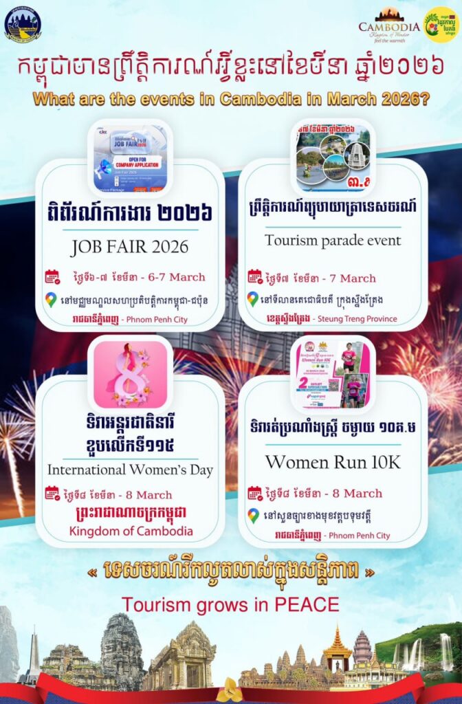 ដោយឡែកពីថ្ងៃទី៦ ដល់ថ្ងៃទី៧ ខែមីនា នឹងមានពិព័រណ៍ការងារ ២០២៦ នៅរាជធានីភ្នំពេញ ។ថ្ងៃទី៧ ខែមីនា នឹងមានព្រឹត្តិការណ៍ព្យុហយាត្រាទេសចរណ៍ នៅខេត្តស្ទឹងត្រែង ខណៈនៅថ្ងៃទី៨ ខែមីនា នឹងមានទិវាអន្តរជាតិនារីនៃព្រះរាជាណាចក្រកម្ពុជា។