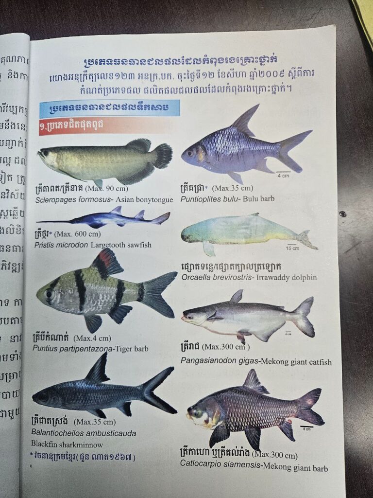 ត្រីទឹកសាប កម្ពុជាចំនួន ២៦ ប្រភេទ ត្រូវ បានដាក់ចូលបញ្ជីជាប្រភេទត្រីកម្រដែលជិតផុតពូជ ដូចជា ត្រីគុលរាំង ត្រីរាជ ត្រីគជ្រា ត្រីតាពតឬត្រីនាគ ត្រីថ្ករ ត្រីបីកំណាត់ ត្រីជាតស្រង់ ត្រីត្រសក់ក្រហម ត្រីត្រសក់មាត់ក្រាស់ ត្រីត្រសក់ស ត្រីរមាស ត្រីខ្លាឬត្រីកន្រ្តប់ខ្លា ត្រីក្បក ត្រីកញ្ចុះក្របី ត្រីស្ទក់ ត្រីឆ្មាក្រពើ និងត្រីក្របីចំនួន ៣ប្រភេទទៀត។ ក្រៅពីនេះមានផ្សោត អណ្ដើកសង្កល់ អណ្ដើកក្កែក អណ្ដើកស្រែឬអណ្ដើកក្បាលធំ អណ្ដើកសោម កន្ធាយអាស៊ី និងកន្ធាយក្បាលកង្កែបឬល្មេច៕