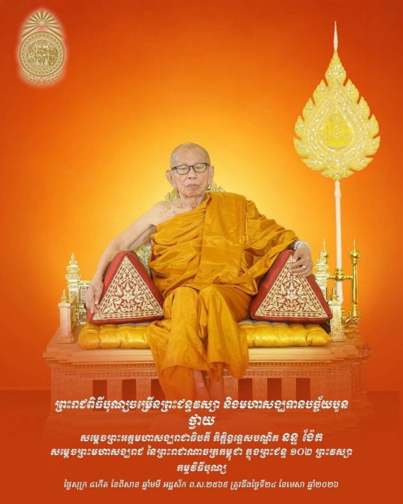 ព្រះរាជពិធីបុណ្យចម្រើនព្រះជន្មវស្សា និងមហាសង្ឃទានបច្ច័យបួនថ្វាយសម្តេចព្រះអគ្គមហាសង្ឃរាជាធិបតី កិត្តិឧទ្ទេសបណ្ឌិត នន្ទ ង៉ែត សម្តេចព្រះមហាសង្ឃរាជនៃព្រះរាជាណាចក្រកម្ពុជា ក្នុងព្រះជន្ម ១០២ ព្រះវស្សា នឹងប្រព្រឹត្តទៅនៅថ្ងៃទី២៤ ខែមេសា ឆ្នាំ២០២៦ នៅវត្តបទុមវតី រាជធានីភ្នំពេញ ដោយមានការអញ្ជើញចូលរួមពី សម្តេចមហាបវរធិបតី ហ៊ុន ម៉ាណែត និងលោកជំទាវបណ្ឌិត ពេជ ចន្ទមុន្នី។