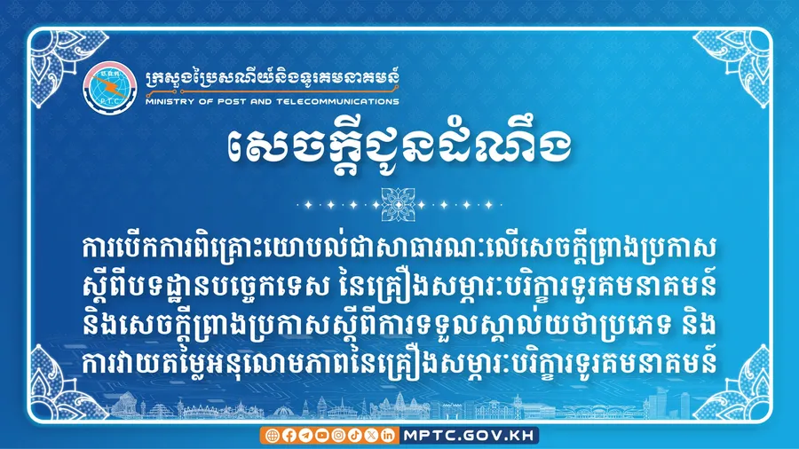 ភ្នំពេញ៖ ក្រសួងប្រៃសណីយ៍និងទូរគមនាគមន៍ (ក.ប.ទ.) និងនិយ័តករទូរគមនាគមន៍កម្ពុជា (ន.ទ.ក.) សូមជម្រាបជូនប្រតិបត្តិករ ភាគីពាក់ព័ន្ធ និងសាធារណជន ជ្រាបថា ក.ប.ទ. និង ន.ទ.ក. បានរៀបចំ ១) សេចក្តីព្រាងប្រកាសស្តីពីបទដ្ឋានបច្ចេកទេសនៃគ្រឿងសម្ភារៈបរិក្ខារទូរគមនាគមន៍ និង ២) សេចក្តីព្រាងប្រកាសស្តីពីការទទួលស្គាល់យថាប្រភេទ និងការវាយតម្លៃអនុលោមភាពនៃគ្រឿងសម្ភារៈបរិក្ខារទូរគមនាគមន៍។ ដើម្បីឱ្យសេចក្តីព្រាងប្រកាសទាំងនេះកាន់តែគ្រប់ជ្រុងជ្រោយ ក.ប.ទ. និង ន.ទ.ក. សូមអញ្ជើញ ប្រតិបត្តិករ ភាគីពាក់ព័ន្ធ និងសាធារណជនចូលរួមផ្តល់មតិយោបល់ដូចខាងក្រោម៖